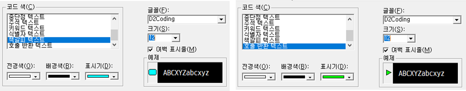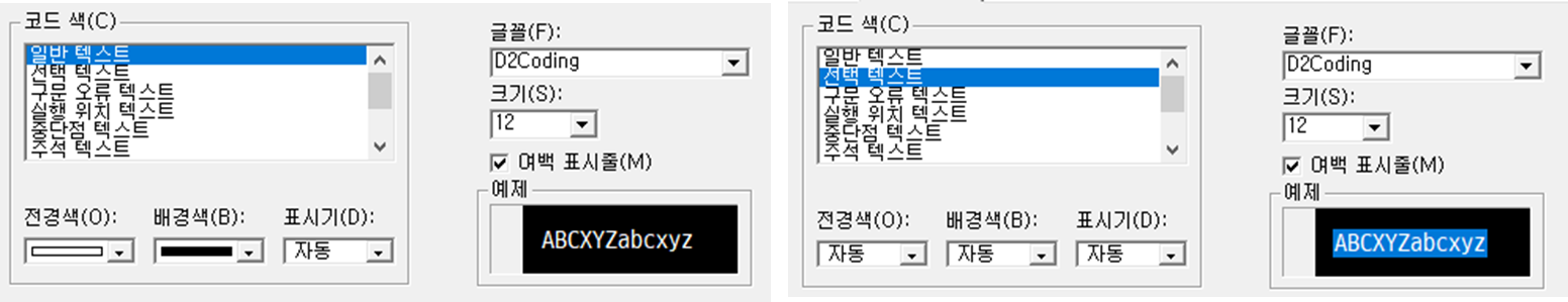 ※ 글꼴 다운로드 링크 https://github.com/naver/d2codingfont - 취향에 따라 폰트 크기는 12로 일괄 적용