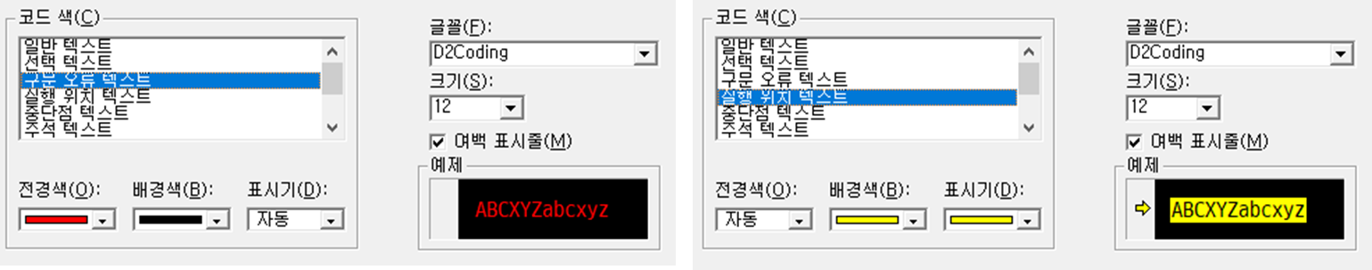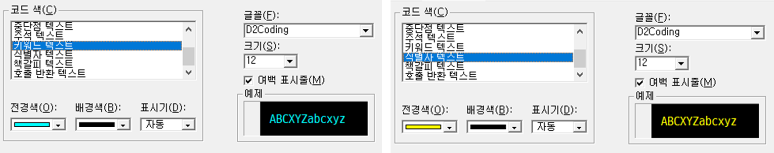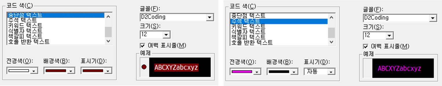 - 편집기 형식에서 코드 색(C) 항목을 바꿔가며 옵션 변경