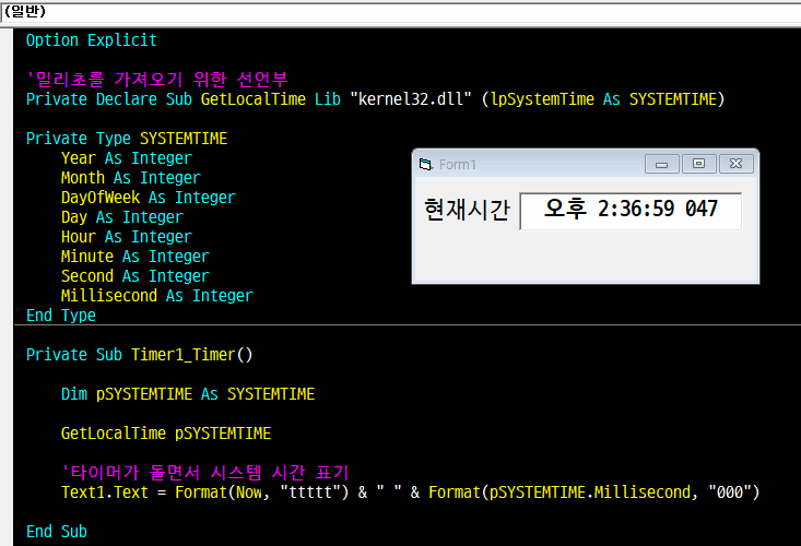 우리가 흔히 밀리세컨드라고 부르는 이 밀리초는 VB 기본 함수로는 표현이 어렵습니다. 시간을 표현하는 대표적인 함수인 Now 함수도 밀리초를 가져오지 않습니다. 따라서 오늘 포스팅에서는 내장 함수가 아닌 DLL 프로시저를 선언하여 밀리초를 가져오는 예제 코드를 작성하도록 하겠습니다.