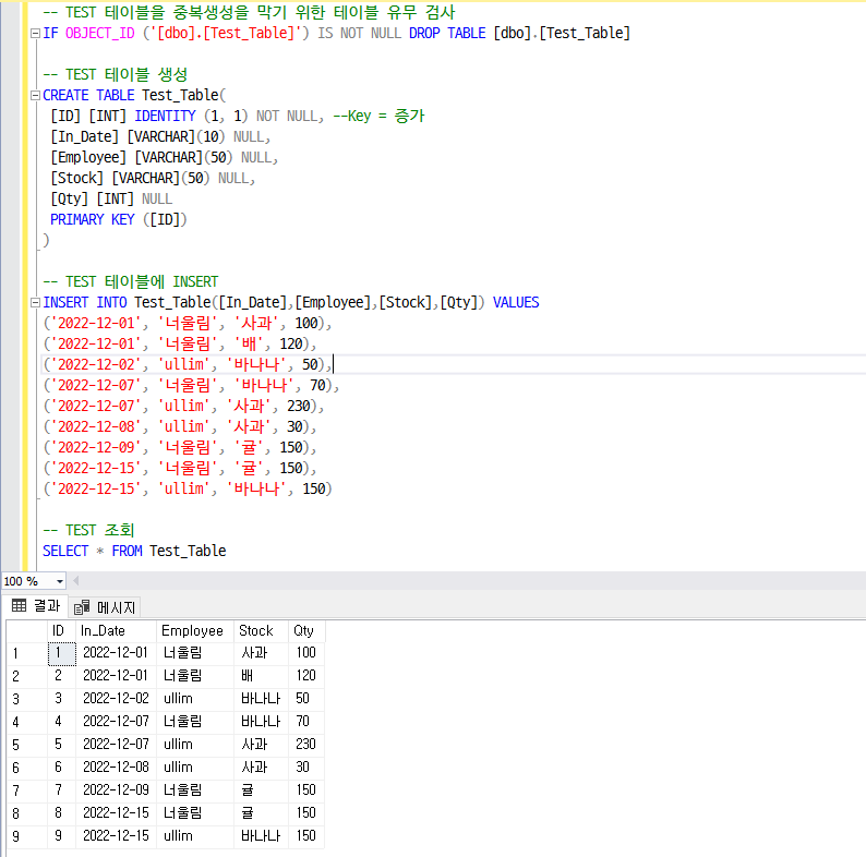 - IF와 OBJECT_ID([테이블명]) 조합을 이용한 테이블 검색은 임시 테이블 중복 검사에도 사용됩니다.