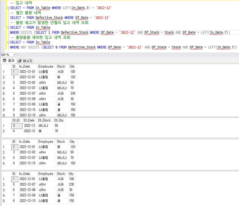 물품 입고 내역 테이블과 불량 내역 테이블 2개를 생성하였으면 'WHERE EXISTS' 절을 활용하여 2022년 12월에 발생한 불량 물품의 입고내역을 검색하는 쿼리문을 작성해 보겠습니다.